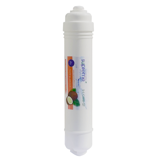 Линеен пост-филтър SUPREME S-L-CARB-QT, с висококачествен активен въглен от кокосови черупки. Използва се за обработка на водата след процеса на обратна осмоза. Филтърът пречиства хлор, органични субстанции, пестициди. Предназначен е за обработка на студена питейна вода, като ú придава отличен вкус и аромат. Капсулованото тяло на филтъра не позволява отмиване и попадане на частици от пълнежа в обработената вода. Филтър S-L-CARB-QT е съвместим с повечето RO системи, налични на пазара. Притежава валидно удостоверение от Полския Национален Институт по Хигиена (PZH), което гарантира, че продукта е с високо качество и подбрани материали подходящи за обработка на питейна вода.